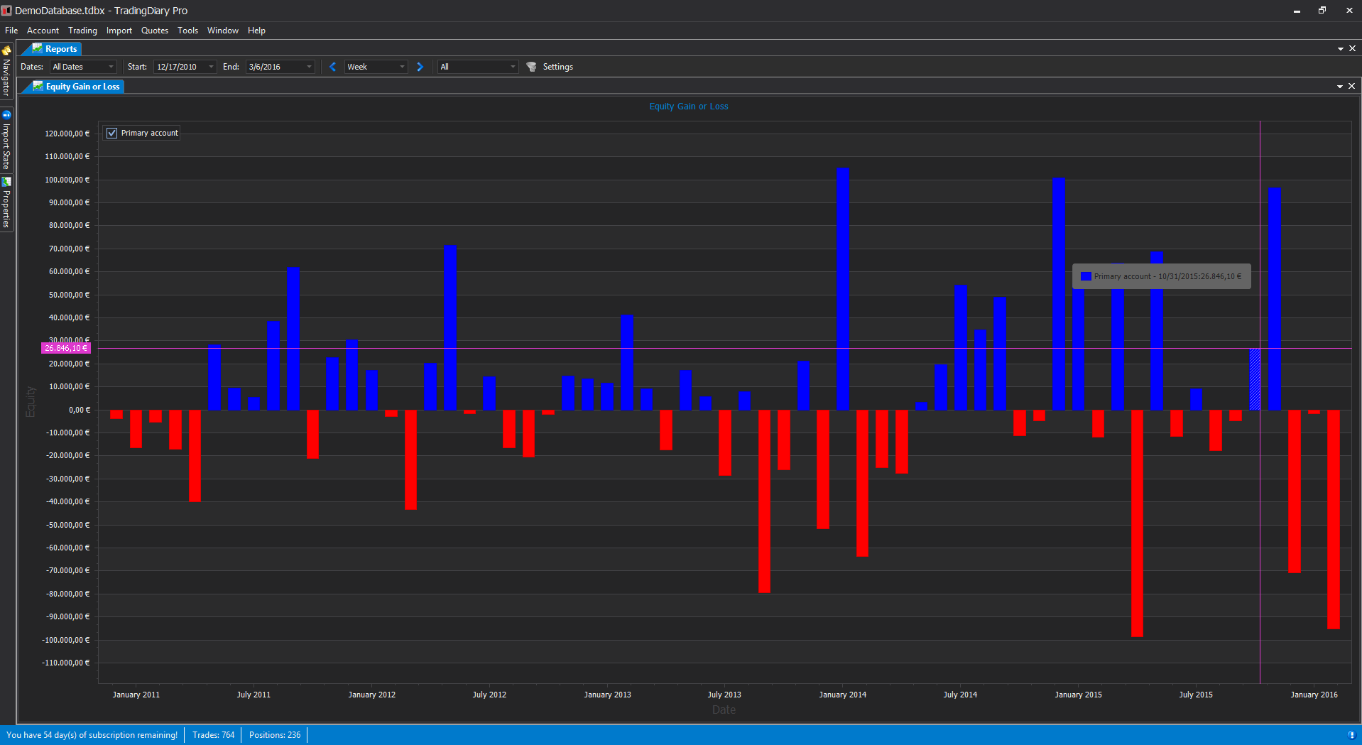 Pivot grid of the positions with chart integration. The positions can be grouped by the following metrics:
